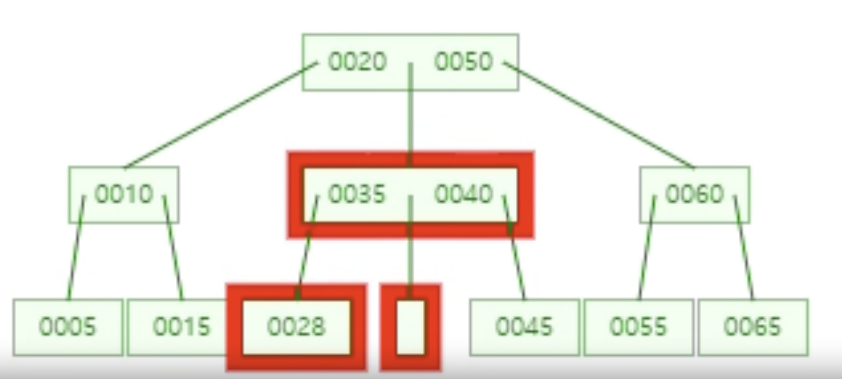 그래서 연관 된 노드 중 28, 35, 40 중 가운데인 35를 부모 노드로 올리고 28, 40을 양쪽에 배치하여 조건 위반을 잘 해결 했다.