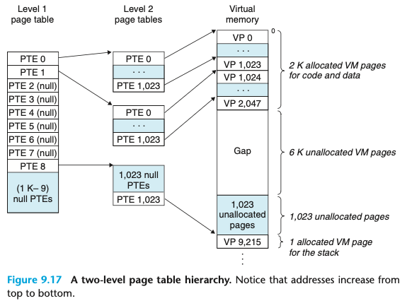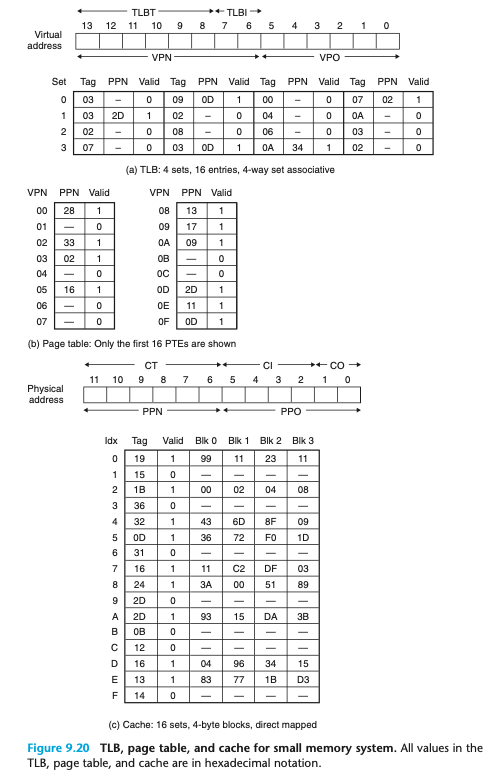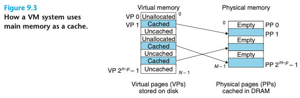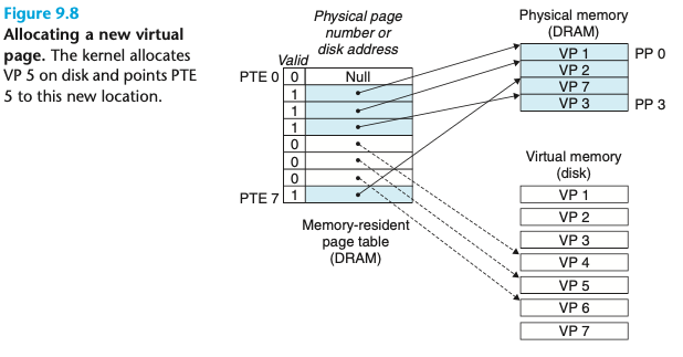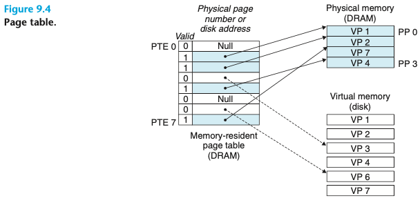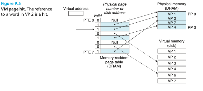 - 가상 페이지 0과 3은 아직 할당되지 않았으므로 디스크에 존재하지 않는다. 1, 4, 6은 물리 메모리에 캐시되어있다.