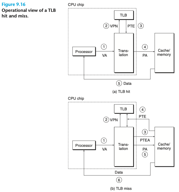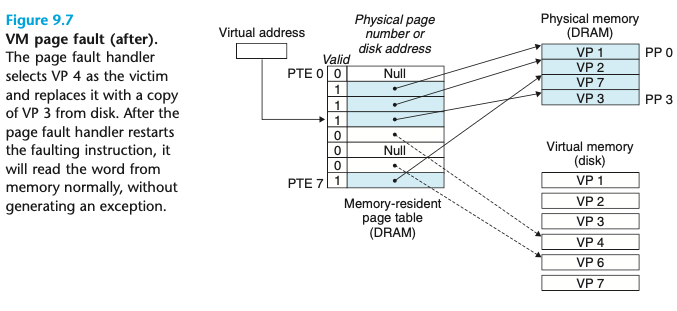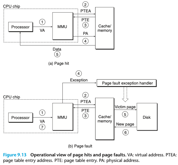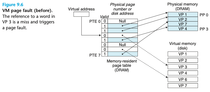 만약 캐시되어 있지 않다면, 해당 가상 페이지가 디스크의 어디에 저장되어 있는지, 물리 메모리에서 어떤 페이지를 희생시킬지, 그리고 디스크에서 DRAM으로 해당 가상 페이지를 복사하는 작업을 수행해야 한다.