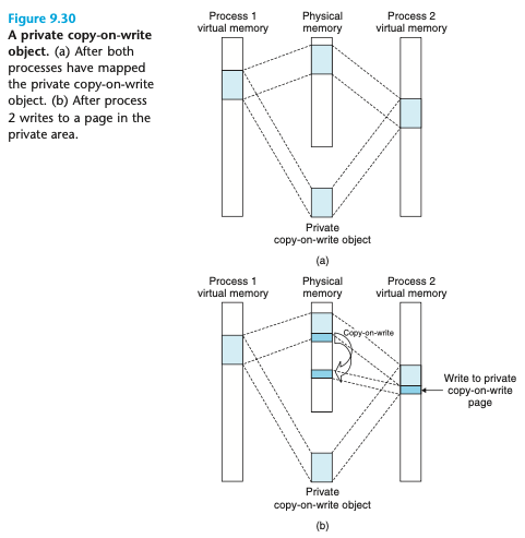 - 처음에는 개인 객체도 공유 객체처럼 시작하며, 물리적 메모리에 단일 복사본만 저장된다. 예를 들어 9.30(a)는 두 개의 프로세스가 동일한 개인 객체를 각각의 가상 메모리 영역에 매핑했다.