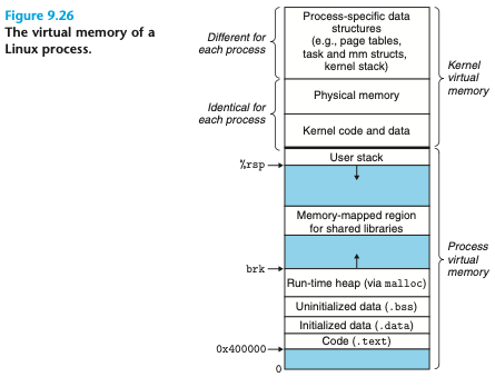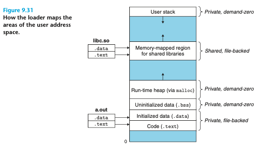 - .bss는 익명에 매핑되고, a.out은 정의된 크기로 할당된다. 아래 그림은 이 다양한 매핑을 요약한 것.