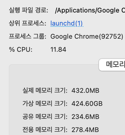 이 그림은 내 맥북에서 스크린샷 촬영한 내용인데, Google Chrome이 실제 메모리와 가상 메모리 크기가 차원이 다른 크기의 메모리 크기 차이를 가지고 있음을 확인 할 수 있다.