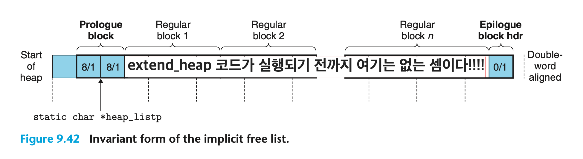 # heap_listp + (3 * 공간 단위) 위치에는 Epilogue Header 배치.