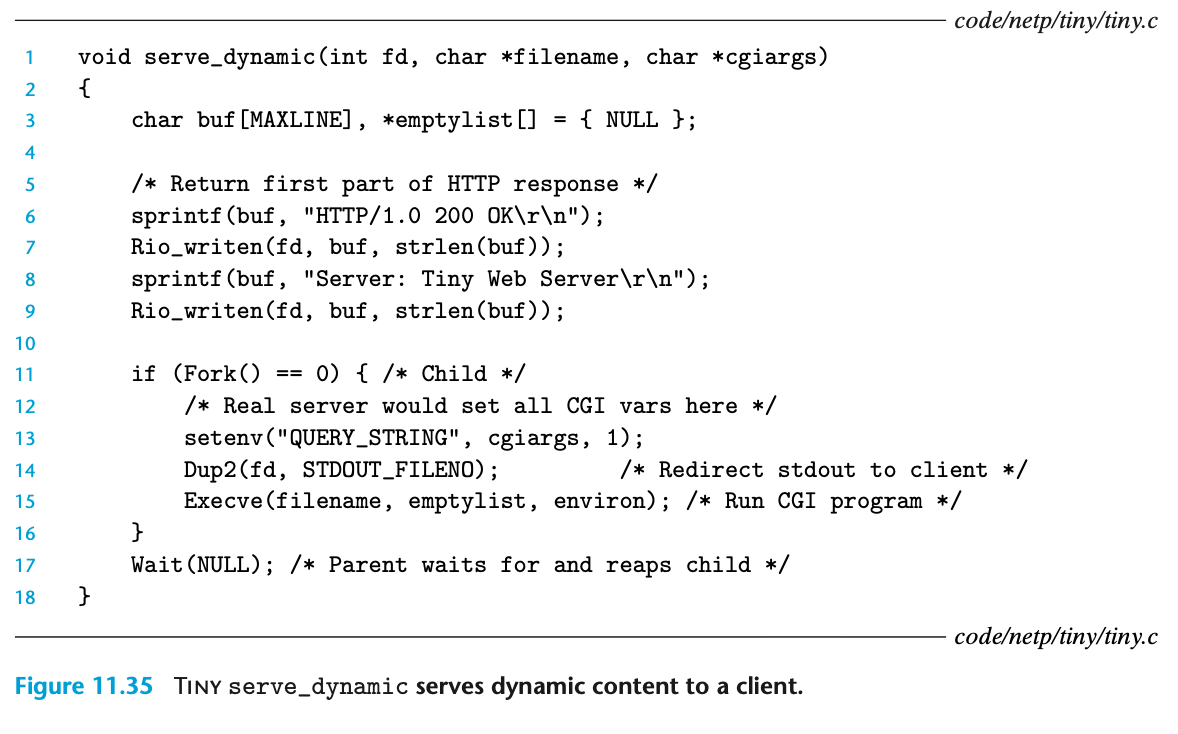 그림 11.35에 나오는 serve_dynamic 함수는 우선 클라이언트에게 성공을 나타내는 응답 라인과 추가적인 정보가 담긴 Server 헤더를 전송하는 것으로 시작한다. 이후 CGI 프로그램이 응답의 나머지 부분을 전송하게 된다. 여기서 CGI 프로그램이 에러를 만날 가능성을 처리하지 않으므로, 우리가 바라는 만큼 견고하지 않다는 점에 주의하자.