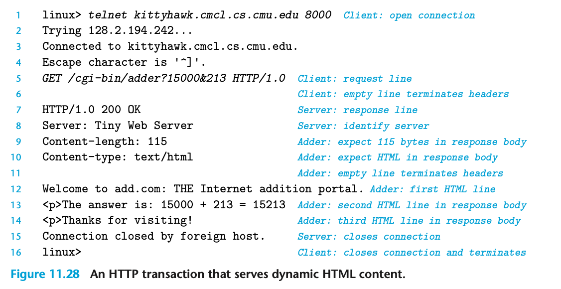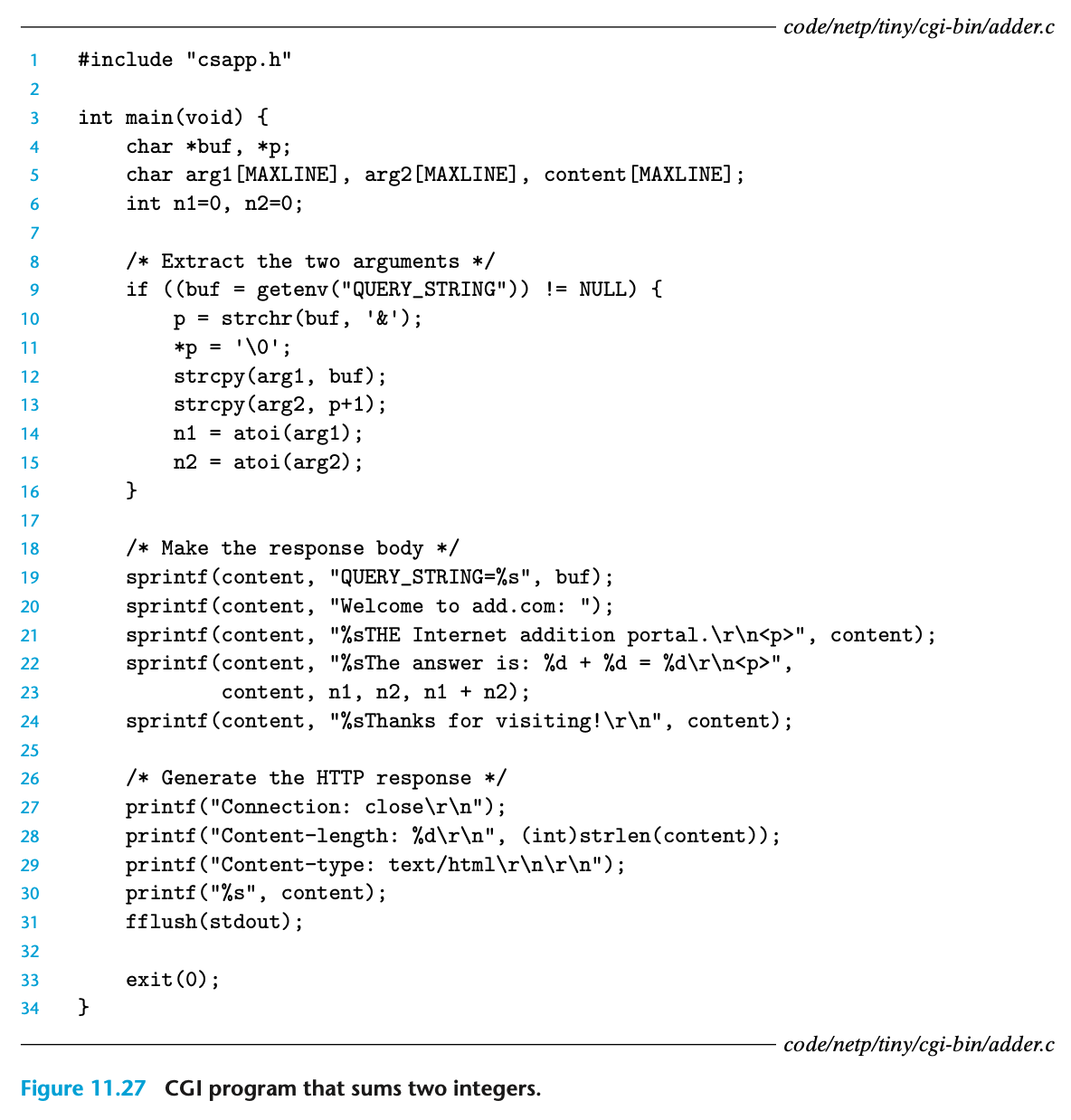 그림 11.27은 두 인수를 합산하여 결과를 포함한 HTML 파일을 클라이언트로 반환하는 간단한 CGI 프로그램의 예시를 보여주며, 그림 11.28은 adder 프로그램을 통한 동적 콘텐츠 제공 HTTP 트랜잭션의 예시를 보여주고 있다.