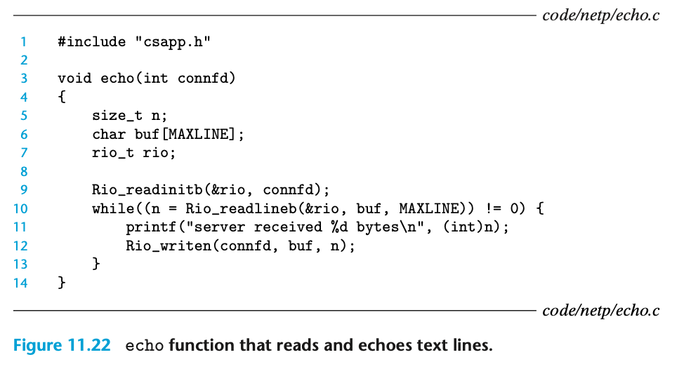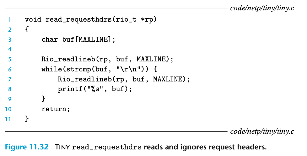 Tiny는 요청 헤더에 있는 정보들을 전혀 사용하지 않는다. 그래서, read_requesthdrs 함수를 호출하여 요청 헤더를 읽어들인 뒤 아무것도 안한다. 또한 요청 헤더의 끝을 나타내는 빈 텍스트 라인은 캐리지 리턴과 라인 피드의 쌍으로 구성되어 있음을 확인할 수 있으며, 이 부분은 6번째 줄에서 검사를 하고 있다.
