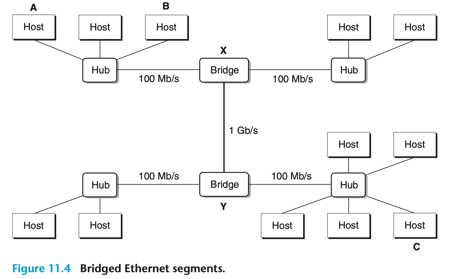 - 그림 11.4와 같이 브리지드 이더넷(bridged Ethernet)이라고 불리는 더 큰 LAN을 구성할 수 있다.