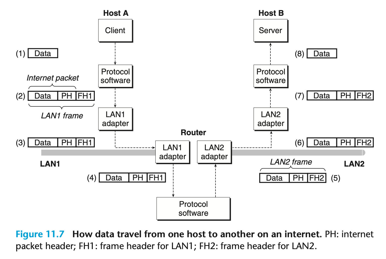 그림 11.7은 호스트와 라우터가 어떻게 서로 호환되지 않는 LAN들 간에 인터넷 프로토콜을 사용하여 데이터를 전송하는지를 보여주는 예시이다.