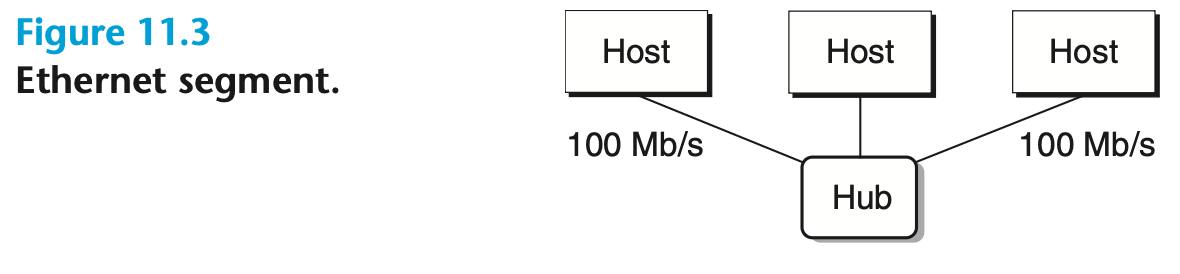 이더넷 세그먼트는 그림 11.3에 나타난 바와 같이, 일반적으로 꼬인 쌍의 케이블(와이어)과 ‘허브’라고 불리는 작은 박스로 구성된다.