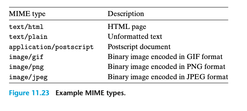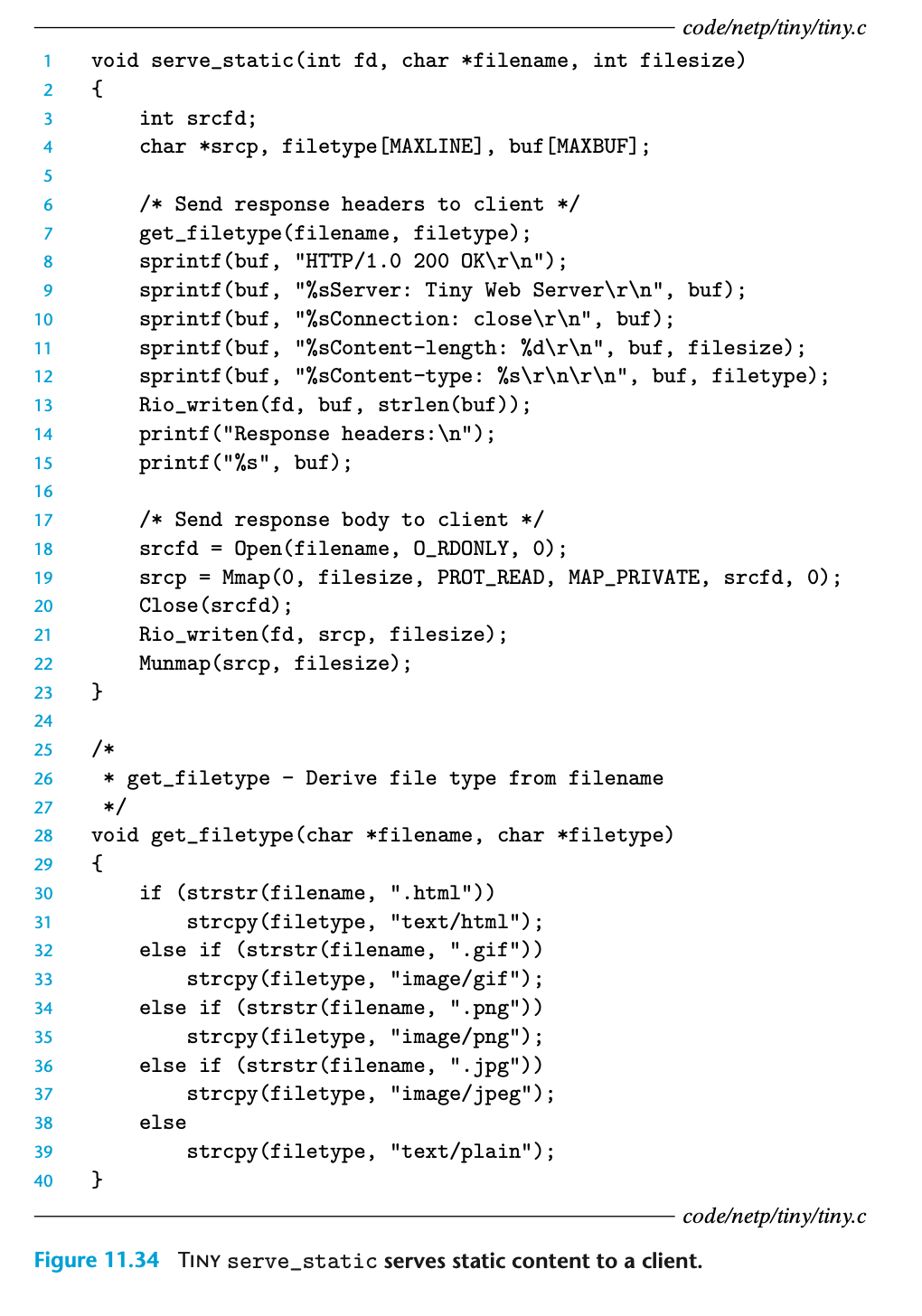 그림 11.34에 나오는 serve_static 함수는 로컬 파일의 내용을 본문으로 포함한 HTTP 응답을 클라이언트에 전송한다. 먼저, 파일 이름의 접미사를 검사하여 파일 타입을 결정한다.(7번째 줄) 그런 다음, 응답 라인과 응답 헤더를 클라이언트에 전송한다.(8~13번째 줄) 여기서 빈 줄이 헤더의 끝을 나타낸다는 점에 주목하자.