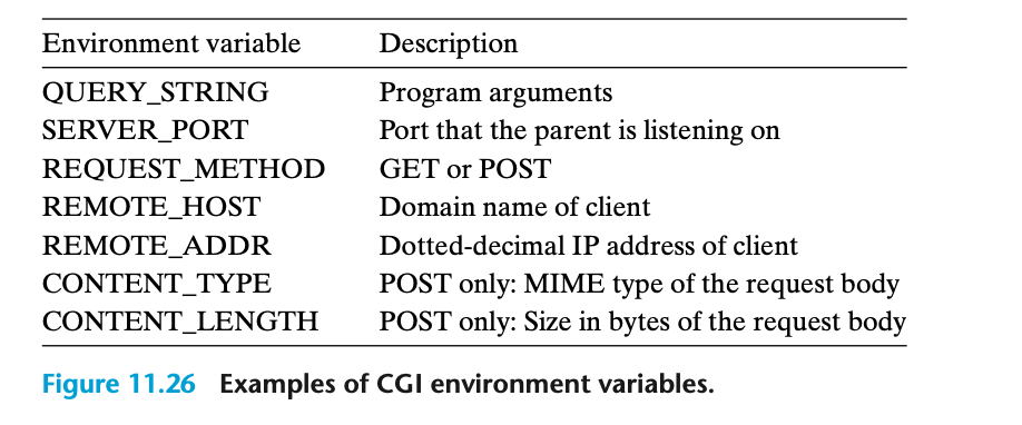 QUERY_STRING이외에도 여러 환경 변수를 정의한다. 그림 11.26에서는 CGI 프로그램이 실행될 때 자동으로 설정되는 여러 환경 변수들의 일부를 볼 수 있다. 이 변수들은 서버에 의해 미리 설정되며, 자식 프로세스(즉, CGI 프로그램)는 이를 이용해 필요한 정보를 얻어 동적 콘텐츠를 생성할 수 있다.