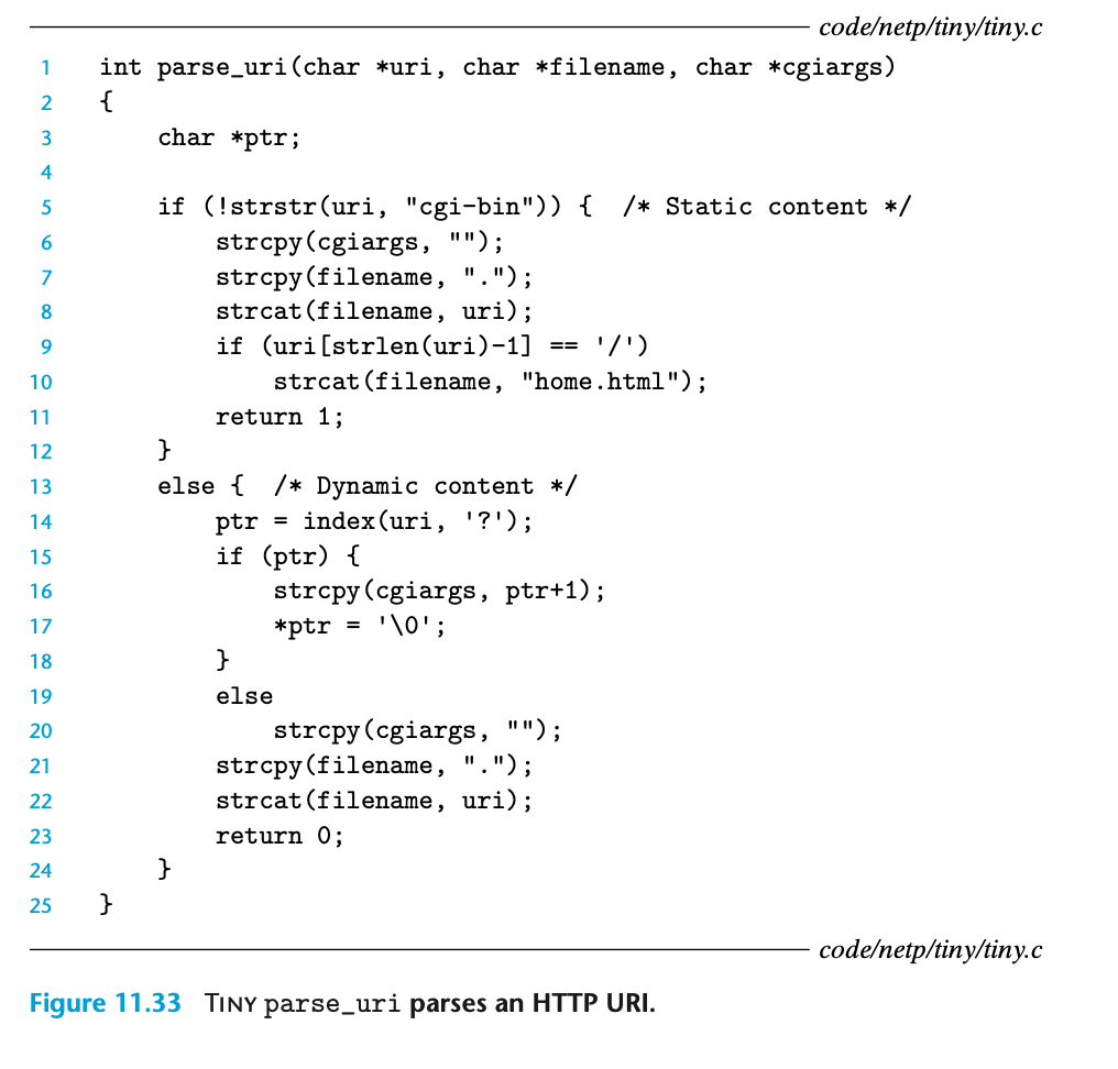 그림 11.33에 나오는 parse_uri 함수는 이러한 정책들을 구현한다. 이 함수는 URI를 파일 이름과 선택적인 CGI 인자 문자열로 파싱합니다. 만약 요청이 정적 콘텐츠에 해당한다면(5번째 줄), CGI 인자 문자열을 지우고(6번째 줄), URI를 ./index.html과 같은 상대 Linux 경로명으로 변환한다.(7~8번째 줄) 만약 URI가 '/' 문자로 끝난다면(9번째 줄), 기본 파일 이름을 덧붙인다.(10번째 줄). 반대로, 요청이 동적 콘텐츠에 해당한다면(13번째 줄), CGI 인자들을 추출한 후(14~20번째 줄) 나머지 URI 부분을 상대 Linux 파일 이름으로 변환한다.(21~22번째 줄)