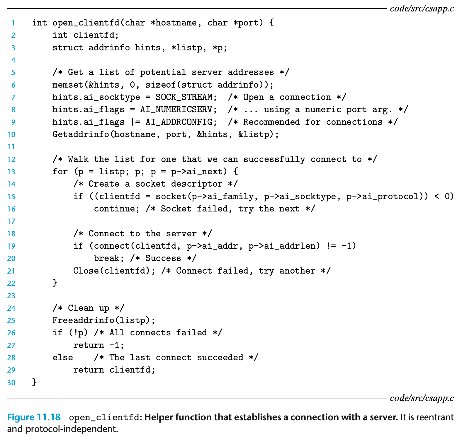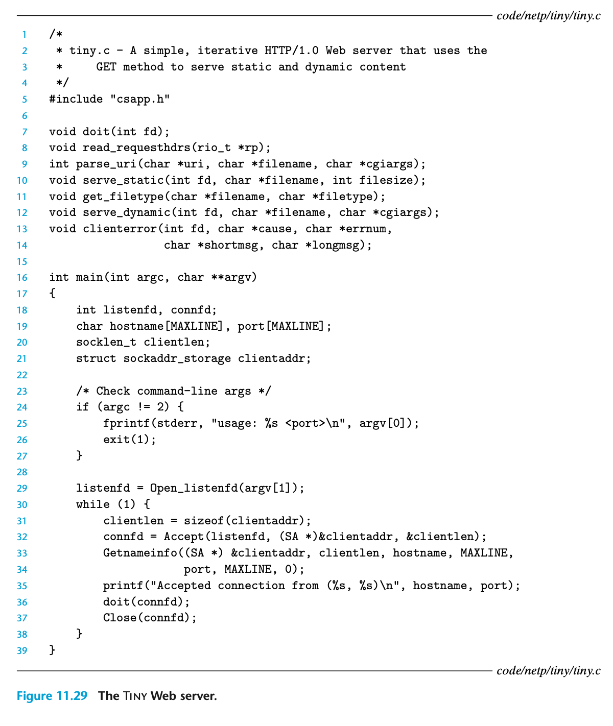 그림 11.29는 Tiny의 메인 루틴을 보여준다. Tiny는 명령줄에서 지정된 포트에서 연결 요청을 대기하는 반복형(iterative) 서버이다.open_listenfd 함수를 호출하여 리스닝 소켓을 연 후, Tiny는 일반적인 무한 서버 루프를 실행한다. 이 루프에서는 반복적으로 연결 요청을 수락(32번째 줄)하고, 트랜잭션을 수행(36번째 줄)하며, 자신의 쪽 연결을 종료(37번째 줄)한다.