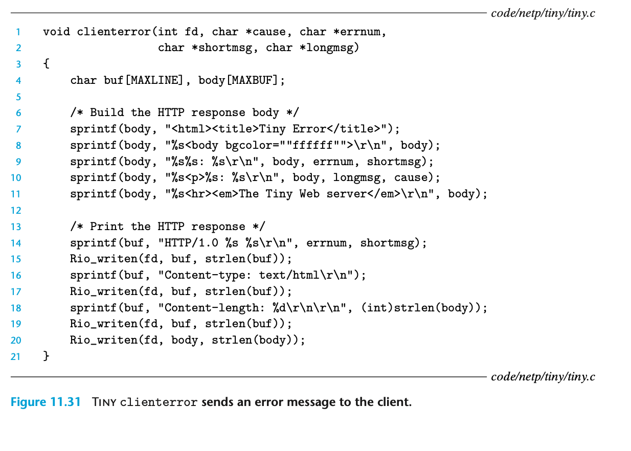 Tiny는 실제 서버가 갖추고 있는 많은 에러 처리 기능들을 제공하지는 않는다. 그러나, 명백한 몇 가지 오류를 검사하고 이를 클라이언트에 보고하는 기능은 포함되어 있다. 그림 11.31에 나타난clienterror 함수는, 응답 라인에 적절한 상태 코드와 상태 메시지를 포함한 HTTP 응답을 클라이언트에 전송하며, 응답 본문에는 브라우저 사용자에게 오류에 대해 설명하는 HTML 파일을 포함하고 있다.