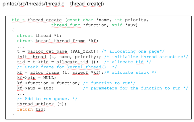 thread_create()의 자세한 내용을 보자. 새 쓰레드 구조를 만드는 함수이다. 초기화, 커널 스택 할당을 하고, 함수가 실행하도록 돕는다.