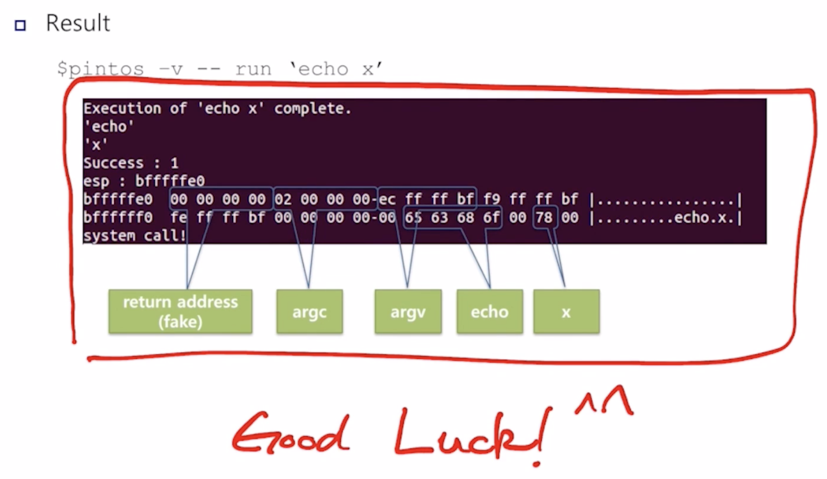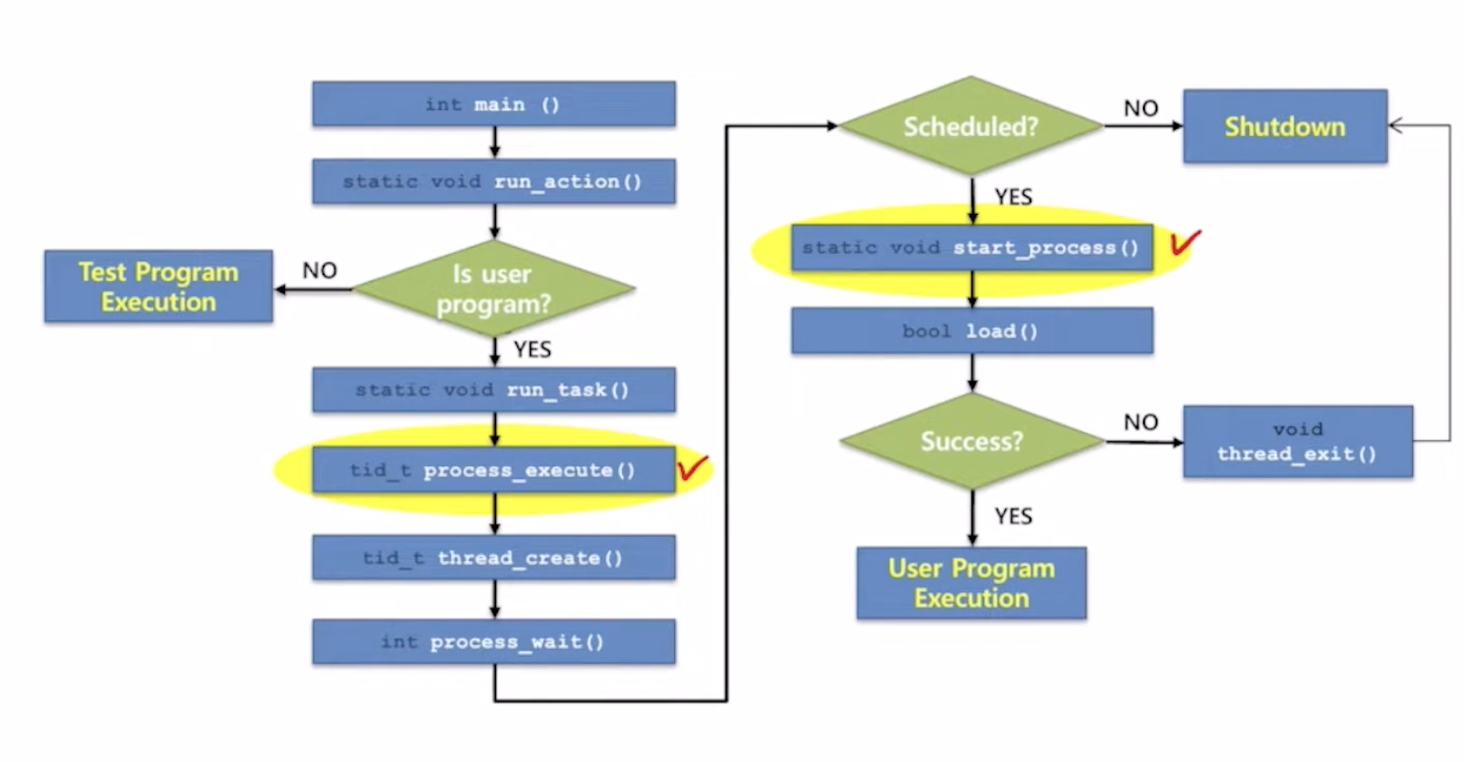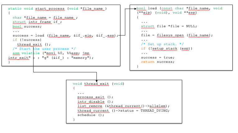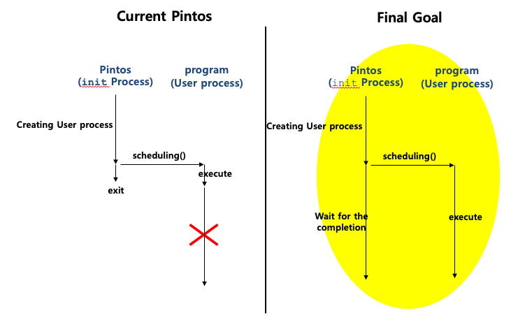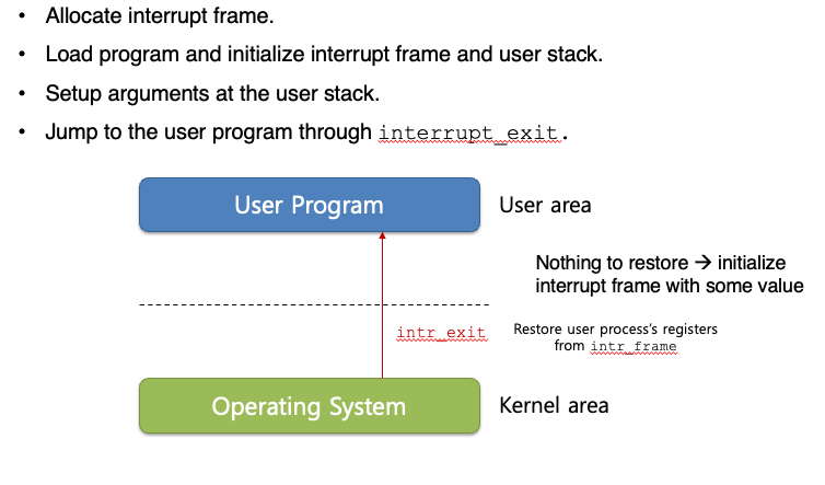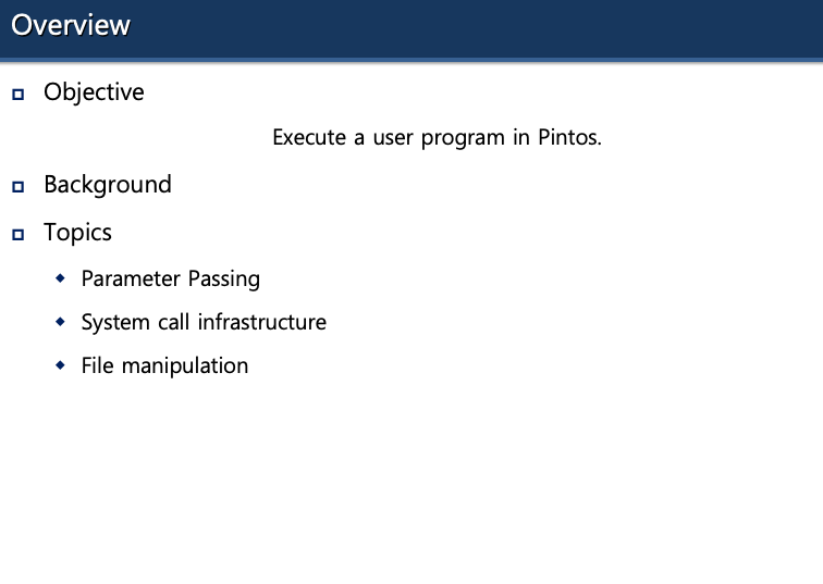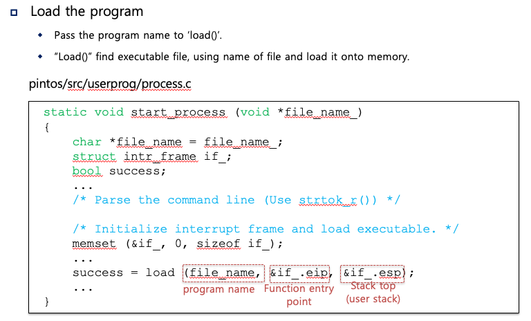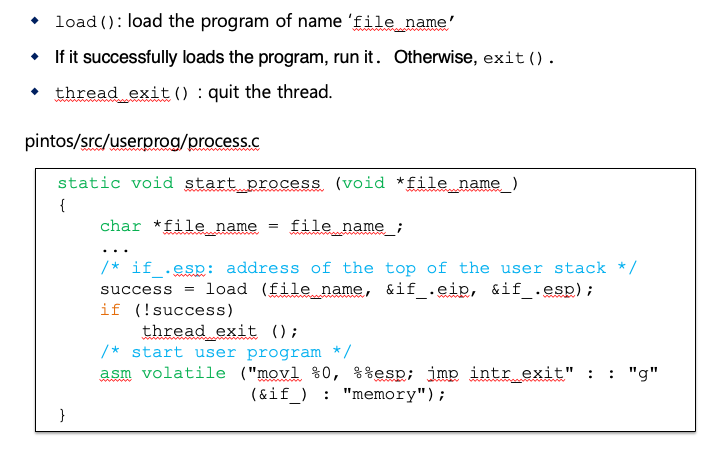 PintOS의 전반적인 user prog 작동 형태를 보았다. 이제 인수를 전달하고 쓰레드를 생성하는 메커니즘을 구현해야한다.