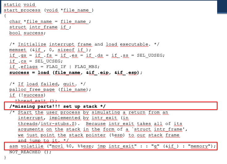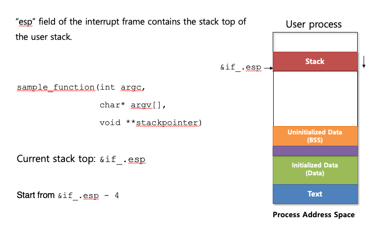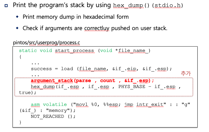 현재의 PintOS는 argment로 사용자 스택을 초기화하는 내용이 없어서 이 내용을 구현해야 한다.