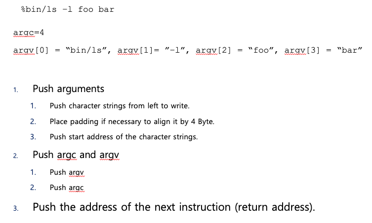 2. 사용자 프로그램을 실행할때 사용자 프로세스에 인수 집합을 전달해야한다. 직접 만들어야한다.