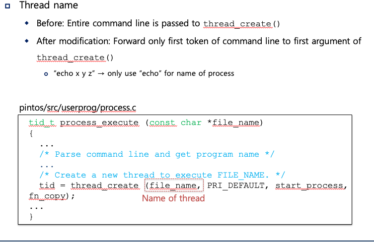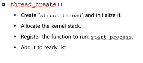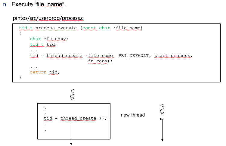 첫 번째는 실행하려는 파일의 이름으로 쓰레드에서 이름으로 전달하고, 그리고 start_process라는 함수를 쓰레드에게 주어서 시작하게 끔한다.