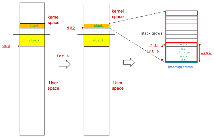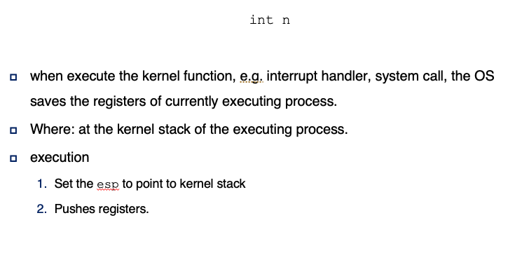 int n이 어떻게든 불리면, esp를 사용자 스택에서 Kernel Stack Top 으로 전환한다음 push 한다.