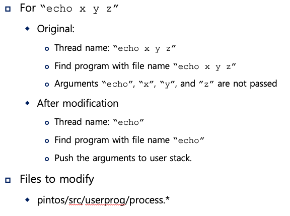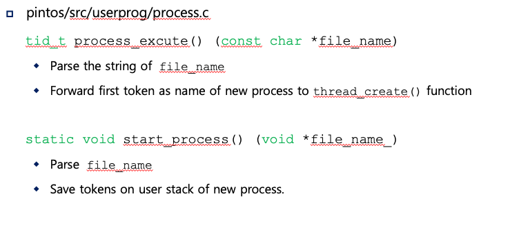 현재 PintOS에서는 명령줄 인수를 토큰화하는 메커니즘이 없다. 프로세스 실행을 위해 전체 명령줄만 전달하는 것이 가능하다.
