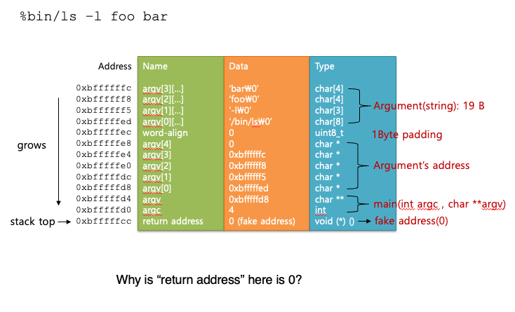 이후 word-align이 투입되고 다시 argv[n]이 Name 필드에 언급되는데, 여기서 Data가 0으로 언급되는경우 argment의 끝을 표시하는 것이다.