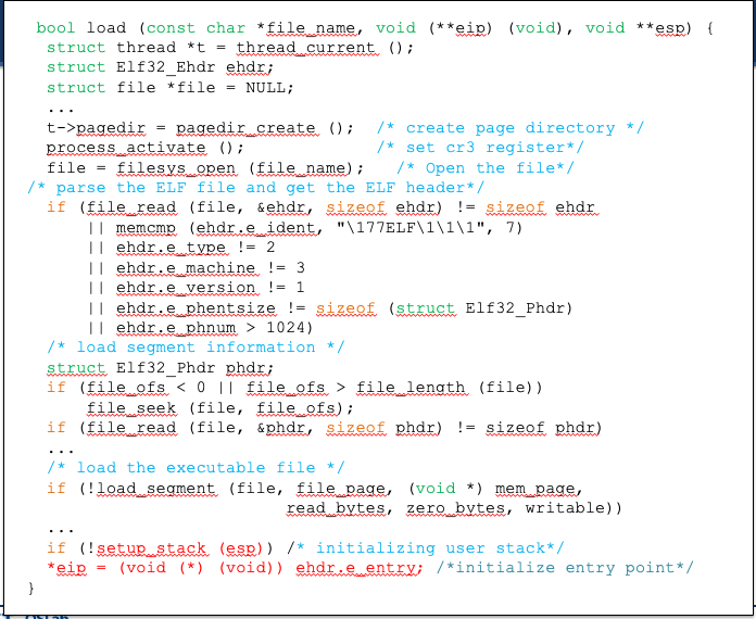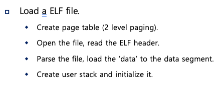 load가 호출되면, 커널은 쓰레드를 위해 페이지 테이블을 생성한다. 그리고 파일을 연다. 이것은 파일이므로 파일을 열고 elf 포맷의 헤더를 읽는다. 이것을 메모리로 가져온다음, elf 헤더를 보면서 이 파일이 어떻게 구성되어있는지에 대한 정보를 확인한다. data, BSS sections, location of binarys. load를 통해 파일을 구문 분석한다음에, data를 data segment에 로드한다.