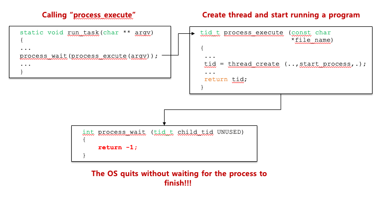 문제는, 현 상태의 process_wait는 딱히 process_execute가 뭘 하는지 관심 없고 그냥 -1를 반환한다. 즉 자식 프로세스가 뭘 생성해서 할 일을 하는데에 있어 대기 해야하는데 그냥 끝내 버린다는 것.