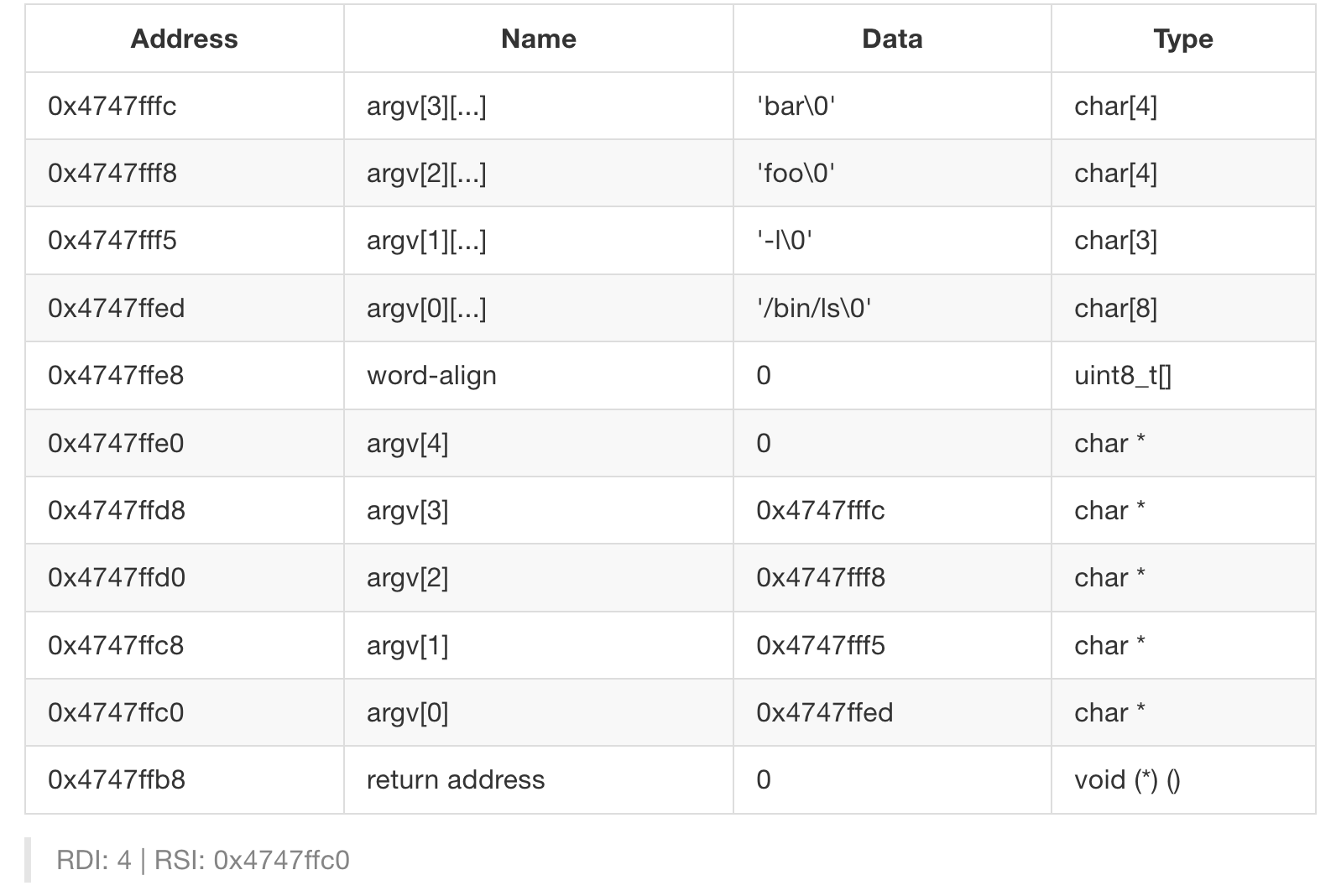 다음 예제는 /bin/ls -l foo bar 라는 코드를 스택에 배치하는 과정이다.