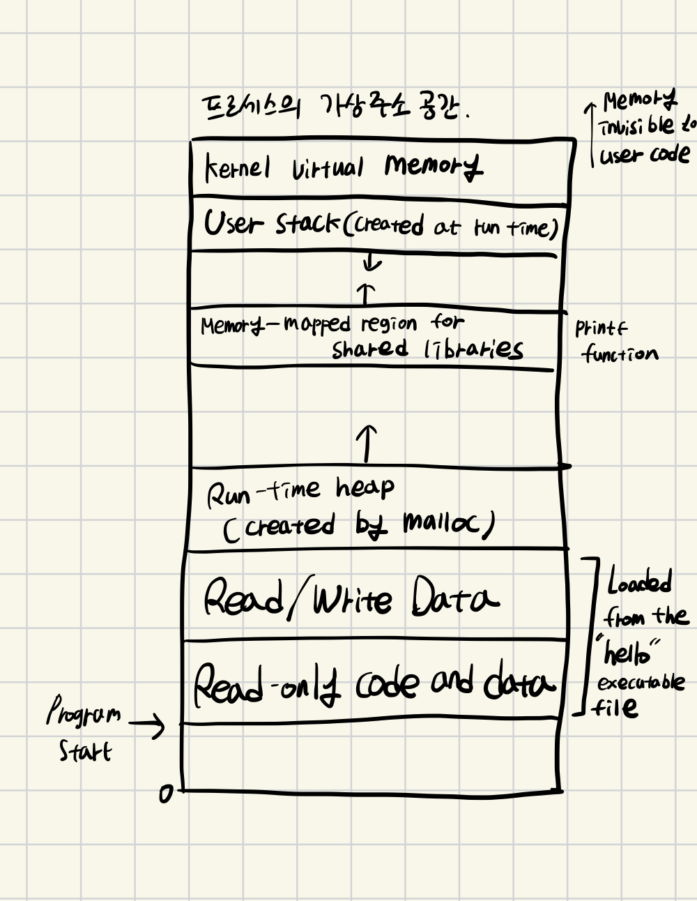 - 코드는 모든 프로세스들이 같은 고정 주소에서 시작한다. 다음에 C 전역변수에 대응되는 데이터 위치들이 따라온다. 코드와 데이터 영역은 실행가능 목적파일인 hello로 부터 직접 초기화된다.