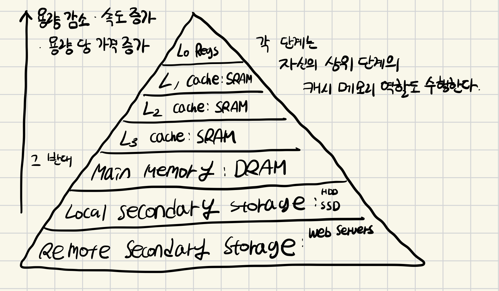 메모리의 계층 구조의 주요 아이디어는, 한 레벨의 저장장치가 다음 하위레벨 저장장치의 캐시 역할을 한다는 것이다. L1의 캐시는 L2, L2의 캐시는 L3이다. L3 캐시는 메인 메모리의 캐시이고, 이런 식으로 앞에서 언급한 계층 구조를 따라 내려 갈 수 있다.