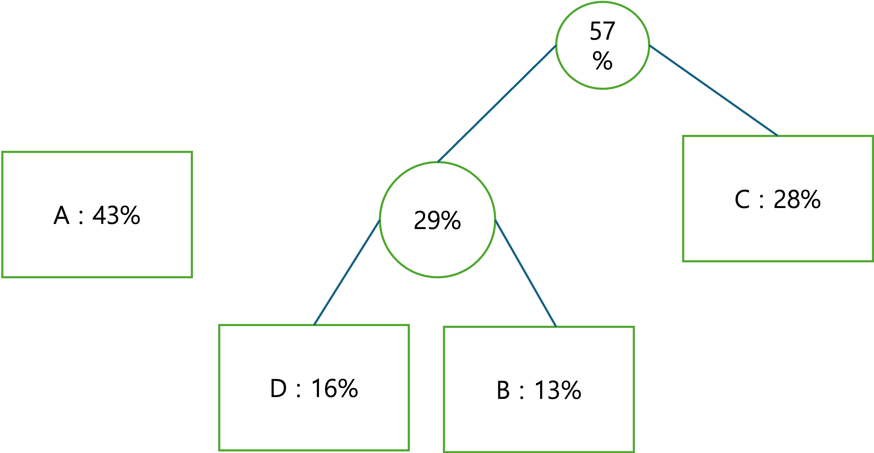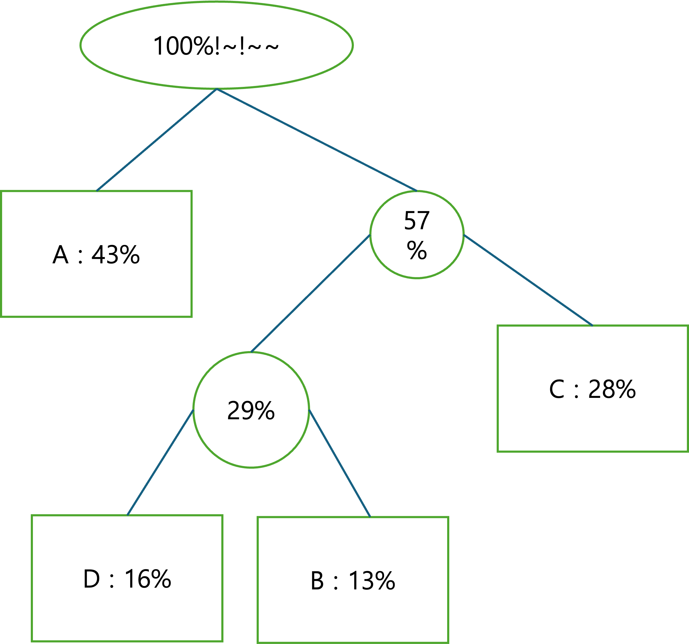 100% 입장에서 왼쪽 자식이면 0 추가, 오른쪽 자식이면 1을 추가한다. 그러면 이렇게 결론이 나온다!
