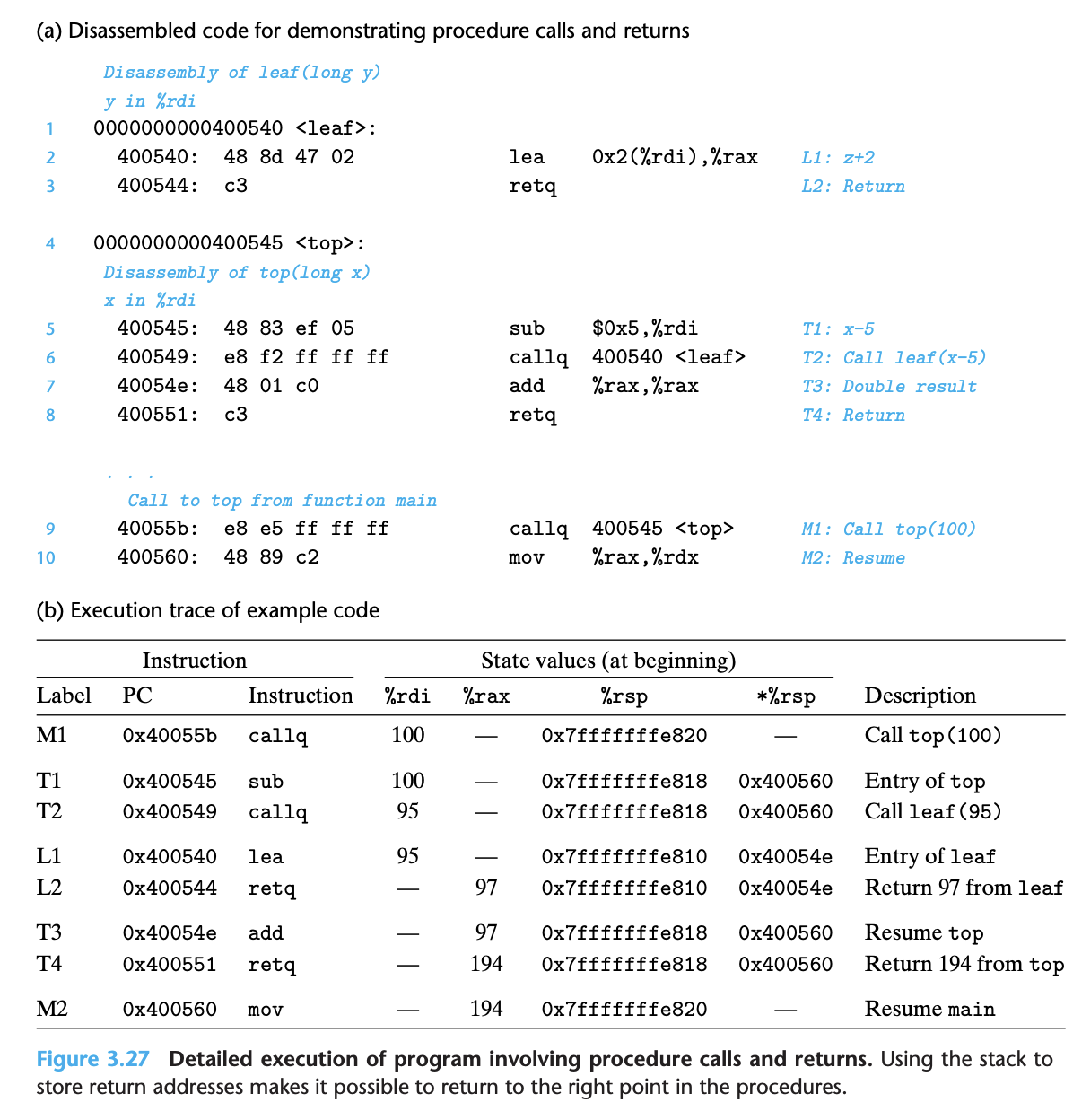 - 이 그림은 앞에 3.2 챕터에서 언급되었던 main, multstore 함수에 대한 call, ret의 실행을 보여준다.