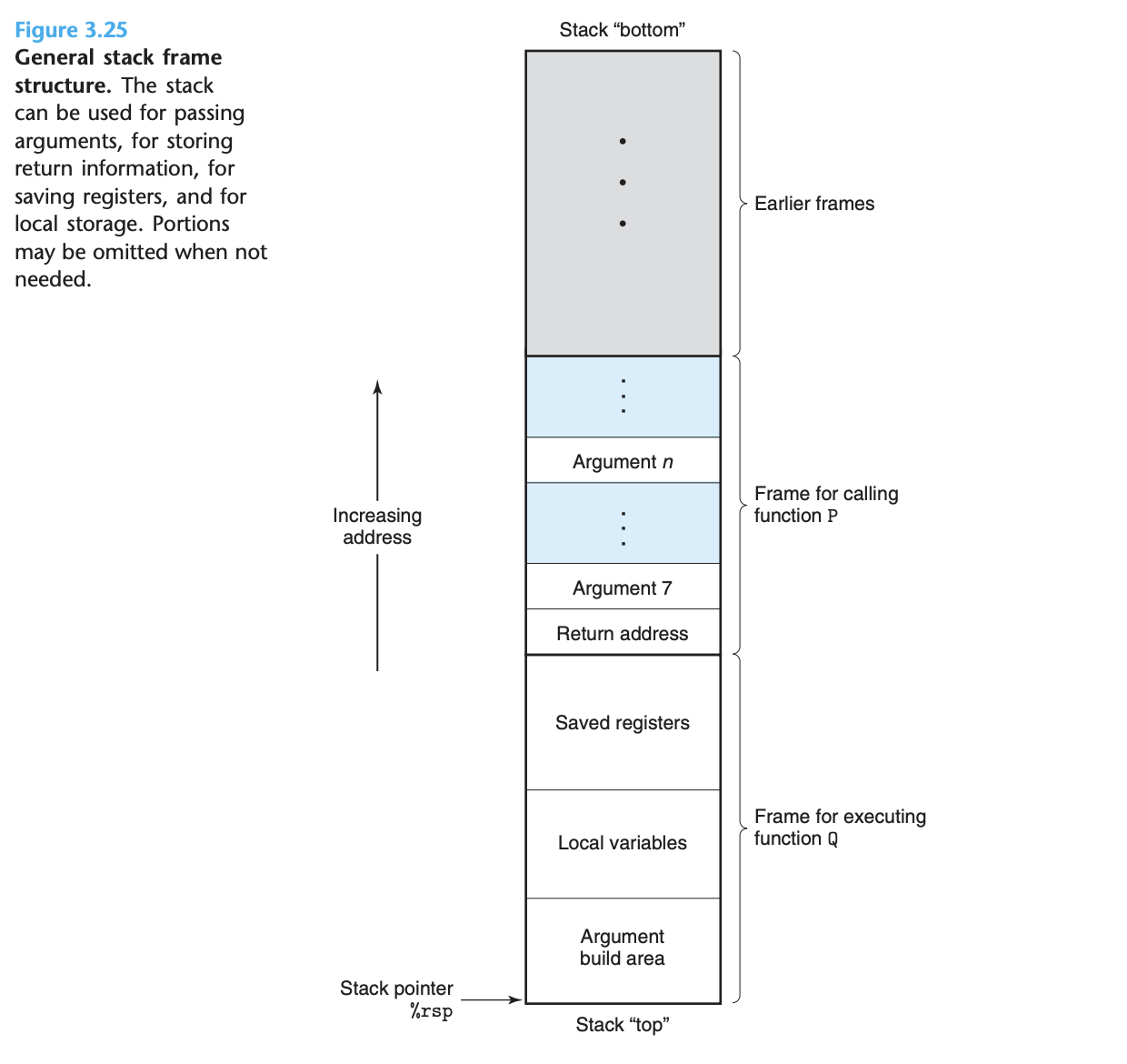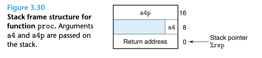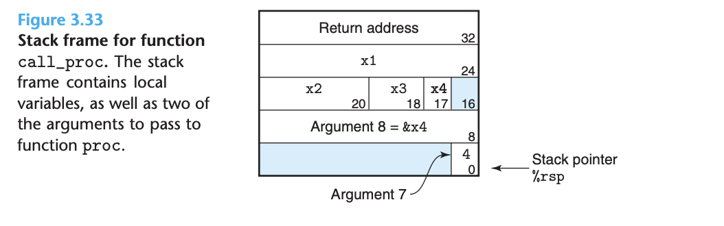 - 64비트 프로시저가 레지스터들에 저장 할 수 있는 개수 이상의 저장공간을 필요로 할 때는 공간을 스택에 할당한다. 이 영역을 프로시저의 스택 프레임이라고 부른다.