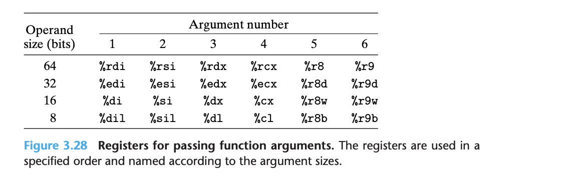 - 예를 들어, 우리는 수많은 함수 예제를 통해서 인자들이 레지스터 %rdi, %rsi 등으로 전달되고 값들이 레지스터 %rax 로 리턴되는 것을 이미 보아왔다.