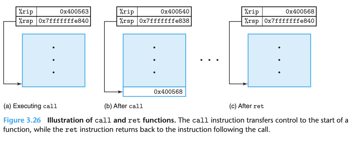 - 이 코드에서, main의 주소 0x400563를 인자로 갖는 call은 함수 multstore를 호출한다. 이 상태가 위의 좀 더 추상적인 그림에 나와 있으며, 스택 포인터 %rsp 와 프로그램 카운터 %rip 의 값으로 표시된다.