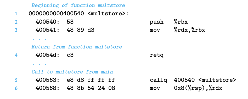- call의 효과는 리턴 주소 0x400568을 스택에 저장하고, 0x400540(b)에 위치한 함수 multsotre의 첫 번째 인스트럭션으로 점프하는 것이다